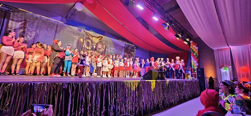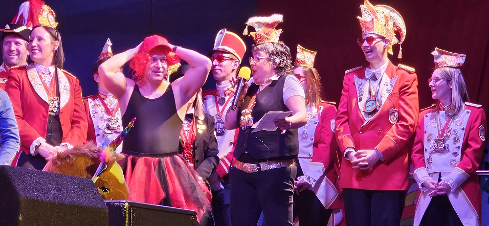 Die orientalische Tanzgruppe „Maha“ zeigte ihr bauchtänzerisches Können, bevor Sascha und Sabine Anders von der KG Rheinfreunde Neuendorf mit einer humorvollen Darstellung des Alltags als Mutter (dumme Nuss) und Sohn (Klugscheißer) die Bühne betraten und das Publikum mit einem Lächeln zurückließen. Die musikalischen und tänzerischen Darbietungen nahmen danach richtig Fahrt auf: Die Gäste vom Alternativkarneval Lohnschdener Zores sorgten mit „Let’s Dance“ für Lacher im Saal. Die Damengarde lud mit Liedern und tänzerischen Einlagen zum Mitsingen und -tanzen ein. Ein energiegeladener Auftritt der Jugendtanzgruppe, brachte eindrucksvoll die Leidenschaft für den Fußball mit sauberen und präzisen Tanzschritten zum Ausdruck.