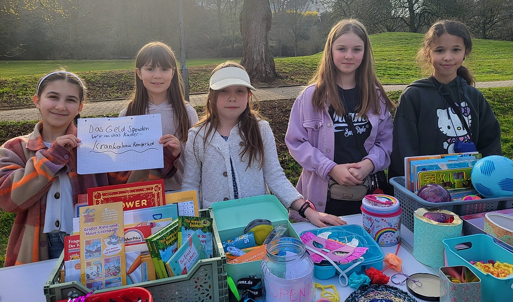 Mit großem Engagement und auf eigene Initiative haben fünf Mädels der 4. Klasse aus Metternich eine besondere Spendenaktion ins Leben gerufen. Unter dem Motto “ Spendenflohmarkt – von Kindern für Kinder“ haben Pia, Sofija, Mira, Lana und Romy Selbstgebasteltes, Bücher und Spielzeuge verkauft und mit viel Herzblut Spenden gesammelt, um den Kindern der Kinderklinik Kemperhof eine Freude zu machen.