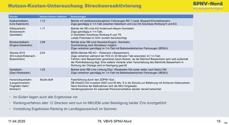 Bei der 78. Verbandsversammlung des SPNV-Nord im April wurde für die Strecke Koblenz-Rübenach ein Nutzen-Kosten-Faktor von 2,63 genannt. Dabei handelt es sich um den Abschnitt Koblenz-Rübenach, doch die Weiterführung der Bahntrasse als Straßenbahn in die Ortsmitte von Bassenheim wird weiterhin untersucht. Das von der Stadt Koblenz beauftragte Gutachten ermittelte einen Nutzen-Kosten-Faktor von 1,54. Mit einem Wert über 1 gilt diese Zahl als qualifizierter Indikator für eine sinnvolle und förderungswürdige Nutzung der Bahntrasse.