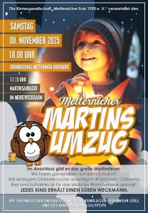 Die Kirmesgesellschaft „Metternicher Eule 1920 e. V.“ lädt alle großen und kleinen Bürger am Samstag, 08. November herzlich zum traditionellen Martinsumzug ein. Der Umzug beginnt um 18:00 Uhr an der Grundschule Metternich Oberdorf. Vorher findet um 17:15 Uhr die Martinsandacht im Mehrzweckraum der Grundschule statt.