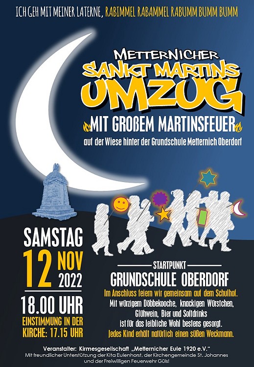 hiermit laden wir euch ganz herzlich zu unserem St.-Martins-Umzug am 12.11.2022 ein. Natürlich gibt es auch wieder Würstchen, Dübbekooche, Bier und alkoholfreie Getränke. Außerdem erhält jedes Kind kostenlos einen Martinswecken. Ab 16 Uhr bauen wir auf dem Schulhof auf.